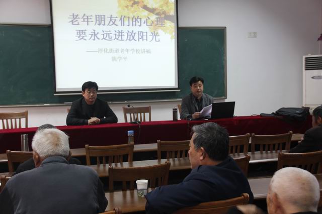 4月23日上午,淳化街道社区教育中心副主任陈学平同志,为街道老年学校的学员们,进行了《老年朋友们的心理要永远迸放阳光》的心理保健讲座。他从什么是老年心理学、老年心理学有哪些特点、老年人如何克服心理变异、如何注重心理调节让心理迸放阳光以及老年心理保健应该注意的几个问题一一作了深入浅出地讲解。这种有针对性的、主题式的讲座,得到了老年学校学员们的欢迎,也让健康的心理滋润着老年人的心田,让老年人的心理迸放出灿烂的阳光,起到了启发、引领、促进的作用。
