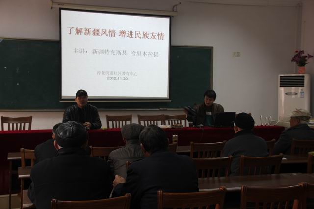 讲座开始,哈里首先给大家播放了一段《伊犁河》的视频,美丽的伊犁河谷,秀丽的风光,富庶的物产,独具情调的维族民族歌谣,一下子吸引了大家的注意力。然后,哈里打开精心制作的PPT,从地理位置,衣食住行,自然风光,物产资源等几个角度,较为详细地向老年学员们介绍了许多新疆方面的知识;特别介绍了自己的故乡,特克斯县城——世界上唯一的一座八卦城,讲座过程中,哈里还把自己事先准备好的新疆特色食品——馕,分发给大家品尝;老年朋友们自始至终兴致勃勃,哈里的讲座帮助大家初步了解了一些新疆方面的知识,有助于增进民族之间的情谊,受到老年学员们的一致欢迎。哈里的带帮领导、街道文体中心的包春娣主任饶有兴趣地听取了哈里的全程讲座,并给予了很高的评价。