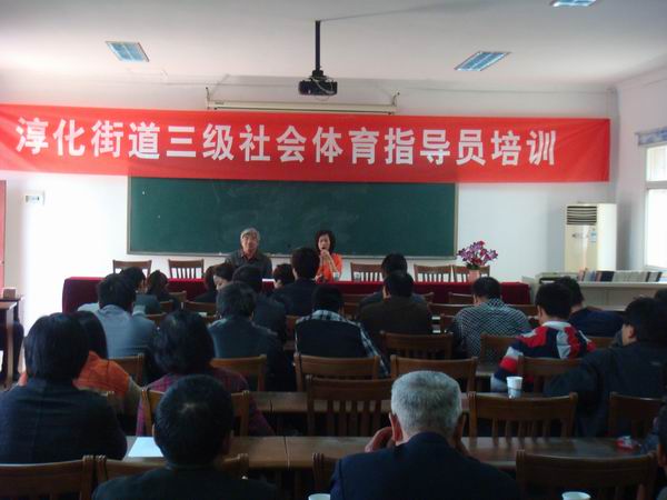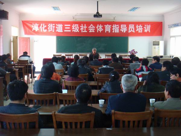 为进一步 提高广大人民群众健康水平,加强社会体育指导员的培训工作,加强服务和指导群众科学健身,满足广大社区居民的健身需求。四月十五日,淳化街道社区教育中心、淳化街道文体中心共同举办了2013年三级社会体育指导员培训班。来自全街道29个社区近百名社区文体文体骨干、体育爱好者、体育积极分子参加了此次体育理论知识培训。