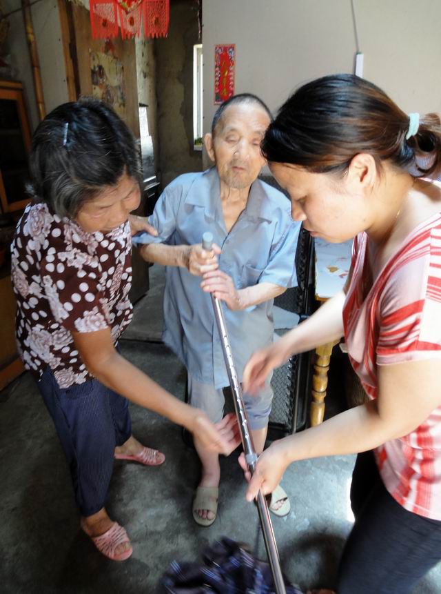 任华其,今年74岁,一只眼睛失明,腿脚行动不便,靠扶板凳才能勉强行走,由于腿脚不便,上厕所时来不及走过去,只能用成人纸尿裤救急,当为老人送去拐杖时,老人家很激动,不停地说谢谢。李忠春从小患小儿麻癖症,造成行动不便,多年来靠拄拐杖行走,村委会工作人员为她带来新拐杖时她高兴的说:“此时此刻我用语言无法表达,谢谢。。。。。”虽然只是短短的几句话,但却是他们对党和社会的感激之情。