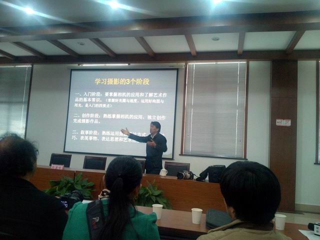 吉龙生主席结合自己的创作历程阐述了摄影创作的三个阶段:入门阶段、创作阶段、叙事阶段。他强调初学者要掌握好相机的应用和了解艺术作品的基本常识,掌握摄影入门的四要点,即掌握好光圈与速度、运用好构图与用光。同时,他也指出,摄影爱好者要不断提高自身文化艺术修养,熟练掌握相机运用,独自创作完成自己的作品,。创作出来的作品才具有思想性、观赏性和艺术性于一体。接下来,他从摄影画面的构图、如何用光、如何鉴赏摄影作品等方面,结合自己的摄影作品一一做了详细阐述。