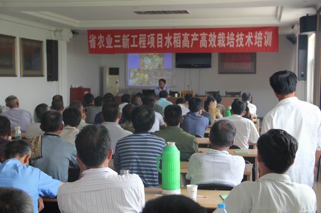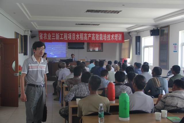 培训会上,王才林所长详细的给大家分析了南粳46、5055、9108等系列水稻的优势所在,并且根据自己多年的理论和实践经验,从品种选择、育秧、种植密度、肥料运筹、水分管理和病虫害防治6个方面详细讲授了水稻高产高效栽培技术。据统计,民主社区今年水稻种植共有六千多亩,其中新引进的南粳46、5055、9108就有三千多亩,为此社区积极联系专家为种植户们开设培训班,旨在确保今年水稻高产丰收。