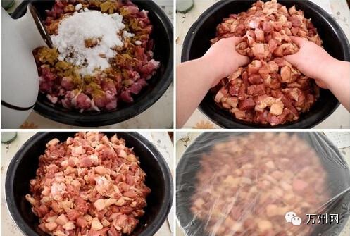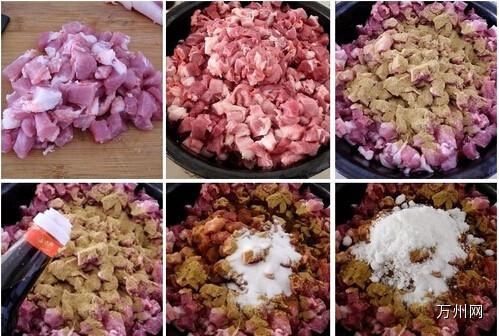 1.猪肉切成2厘米见方的小块,放入一个大盆中,加十三香、美极鲜、盐、白砂糖,再倒上白酒,用手将调料拌匀,充分的抓匀并拌好猪肉,在上面铺上一层保鲜膜,放在阴凉处腌制24小时。