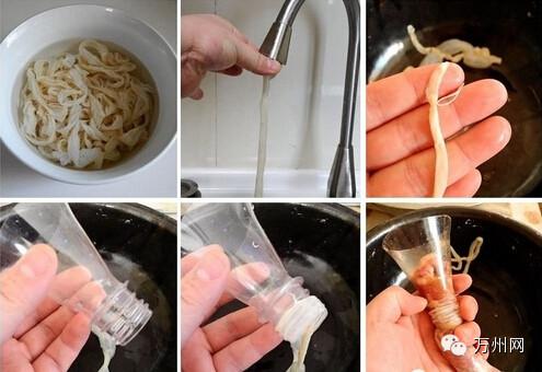 2.肠衣(盐渍肠衣)先用温水洗去表面的盐粒,再在温水中浸泡5小时以上。泡好的肠衣再套在水龙头上,冲洗一下肠衣的内壁,这样做的目的是为了给肠衣内壁起个润滑作用,灌肉的时候好灌。