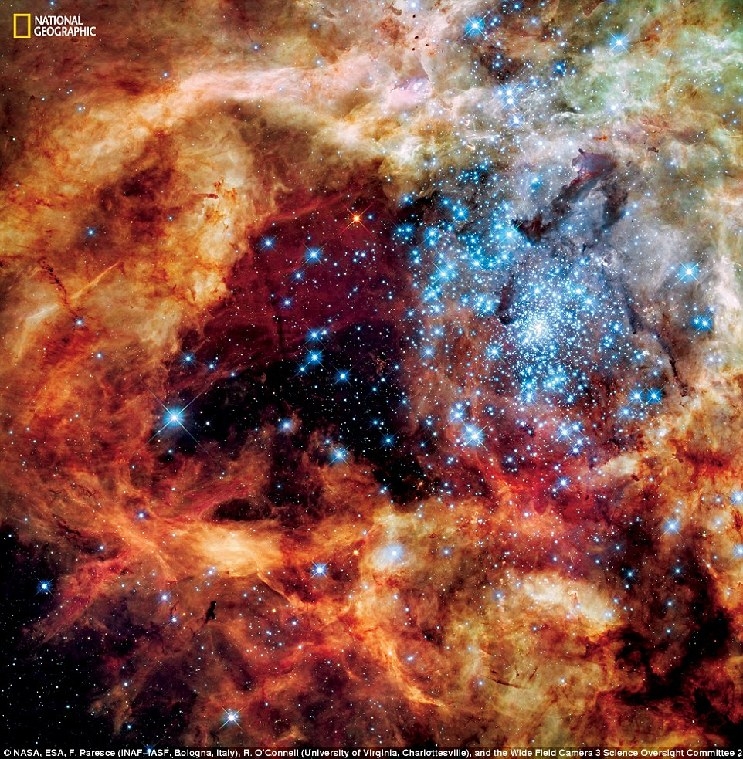 这个巨大的,年轻的恒星团,被称为R136,只有几百万岁,在大麦哲伦星云一个动荡的区域诞生。
