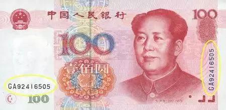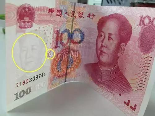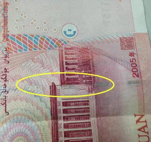 2005版百元钞背面中间偏右,有一条开窗安全鞋,开船部分可以看到由微缩字符“¥100”组成的全息图案。仪器检测具有磁性。