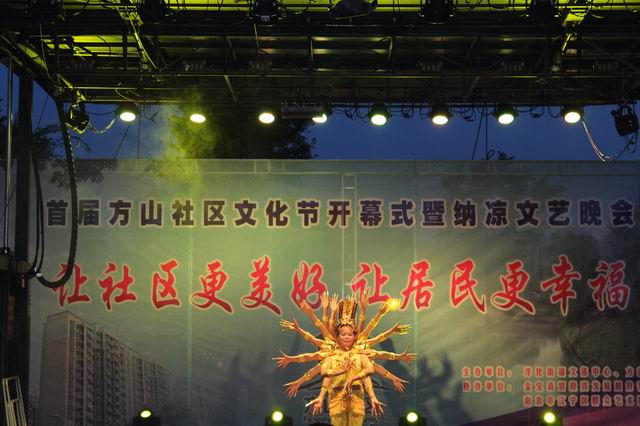方山社区素有深厚的文化底蕴,文化文艺团体发展活跃。首届社区文化节的宗旨是为社区群众文艺爱好者提供展示平台,积极引导广大居民选择健康、科学的生活方式。纳凉晚会的参与主体是社区的文艺爱好者,映山红女子舞龙队的一段“龙腾虎跃”表演拉开了晚会序幕。这些文艺团体各显身手,天景山老年合唱团带来了《左邻右里》、《家和万事兴》两首曲目,唱响社会主义核心价值观。天景山花语健身队表演的《千手观音》让观众耳目一新。老一辈戏曲爱好者演唱了黄梅戏和京剧的经典选段,展现了传统文化的魅力。青少年动感的拉丁串烧舞动全场。