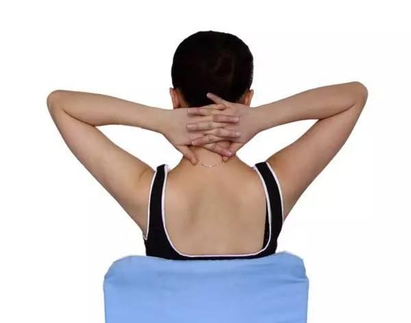 双手交叉,掌心紧贴后颈部,头颈部平行后移用力,双肘尖平行向前用力,维持5秒,每组6-8个。注意这是一组相反用力动作,操作时下颌不要过于上抬。
