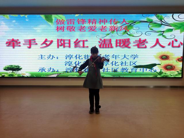 活动于3月10日上午在淳化社区老年大学举行,40多名学生精心准备了合唱《让我们荡起双桨》、二胡演奏、小提琴演奏、独唱、小合唱、舞蹈等十个节目,表达了他们对老人的关心敬爱之情,最后学生们还为老人们送上了自己制作的小礼品,整个活动体现了和谐、融洽的气氛,小少先队员们的表现受到老人们的高度赞扬。