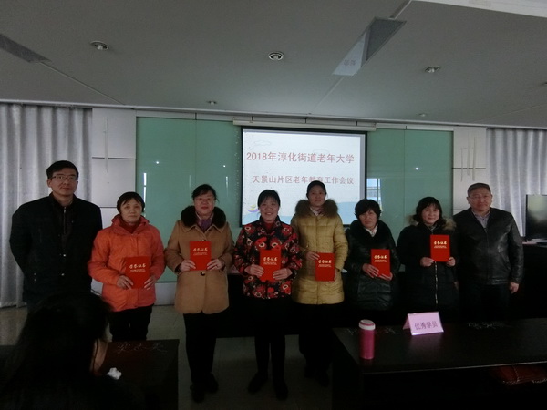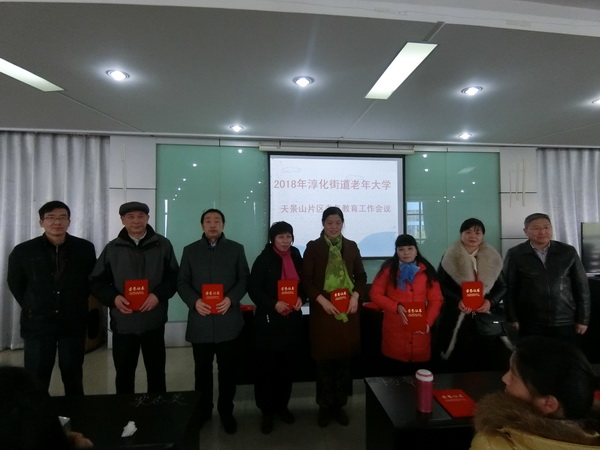 会议由天景山片区老年教育工作负责人陈学平同志主持。首先,史昌才同志宣读了天景山片区老年学校优秀学员的表彰名单,接着分五组对受表彰学员颁发了荣誉证书并合影留念。然后,吴国平主任作了题为《推进基层区域老年教育 让市民享受美好幸福生活》的主题报告,吴主任的报告,一是阐述了什么是老年教育以及天景山区域老年教育的现状;二是回顾了2017年天景山区域老年教育的做法及成效;三是提出了2018年老年教育的目标要求。最后,陈学平同志就如何深刻领会吴国平主任的讲话精神,如何进一步拓展和创新老年教育的内容、方式和途径,提出了具体的贯彻落实意见。